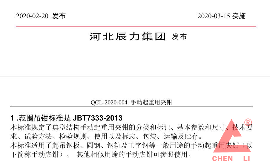 辰力鋼板起重鉗企業(yè)標(biāo)準(zhǔn):范圍吊鉗標(biāo)準(zhǔn)是 JBT7333-2013_了解起重鉗_新聞動(dòng)態(tài)_起重鉗,鋼板起重鉗,吊裝鉗,鋼板鉗,起重吊裝鉗-辰力集團(tuán)有限公司